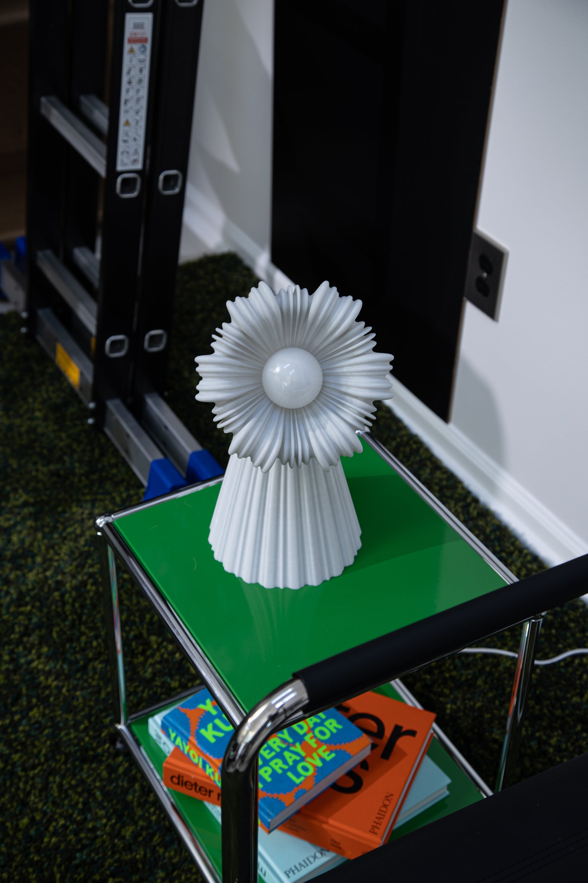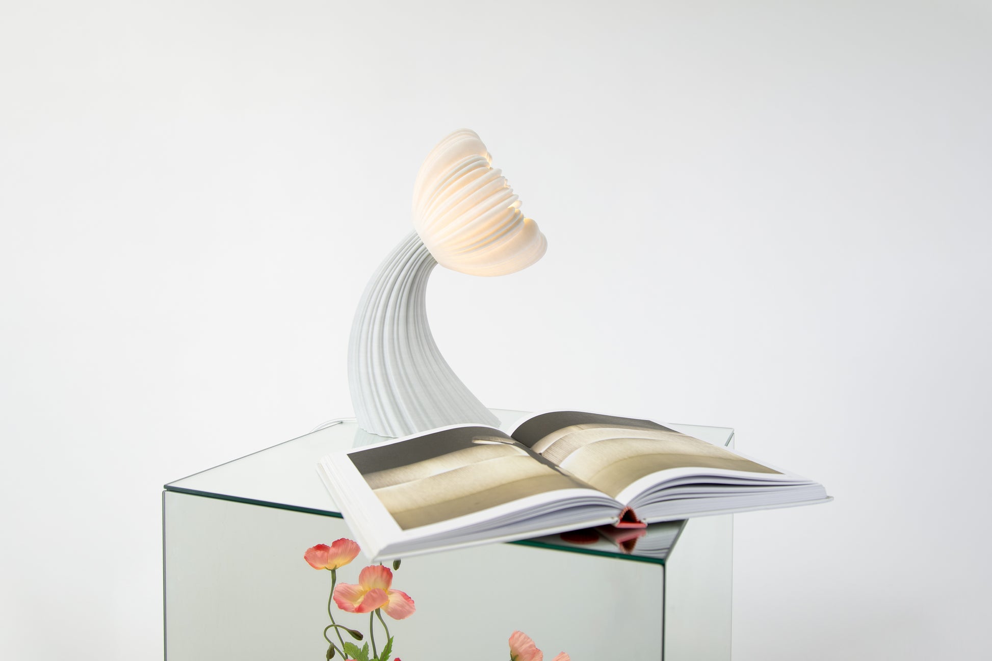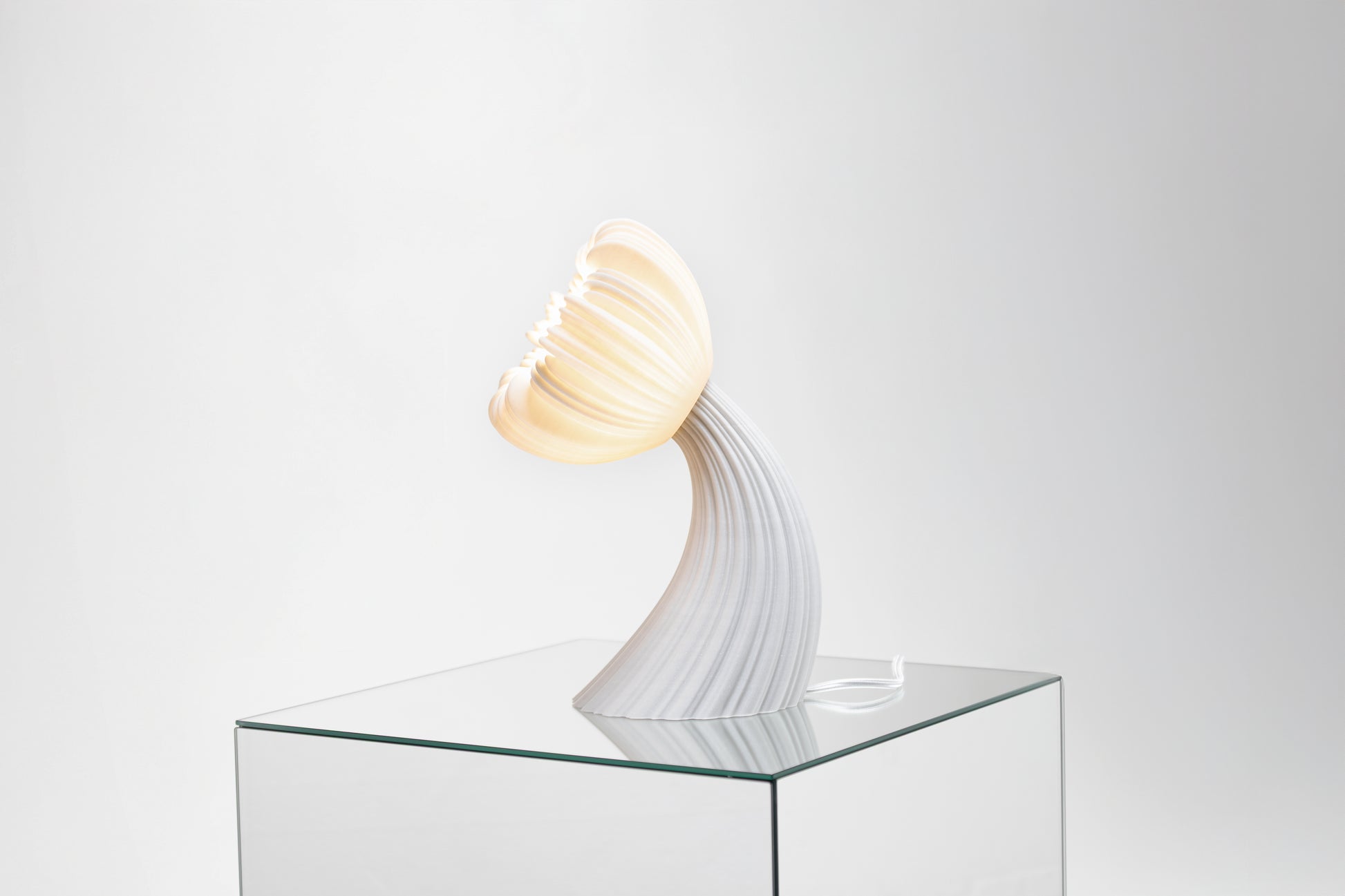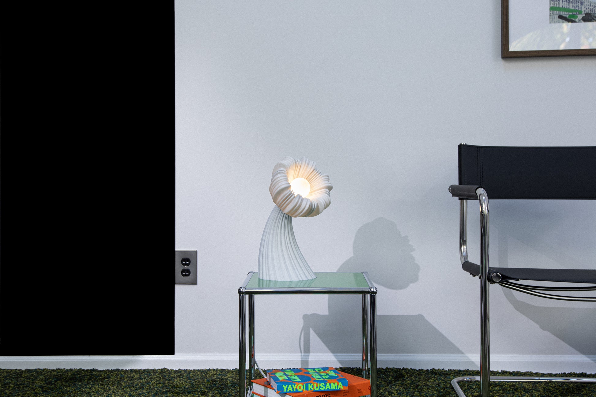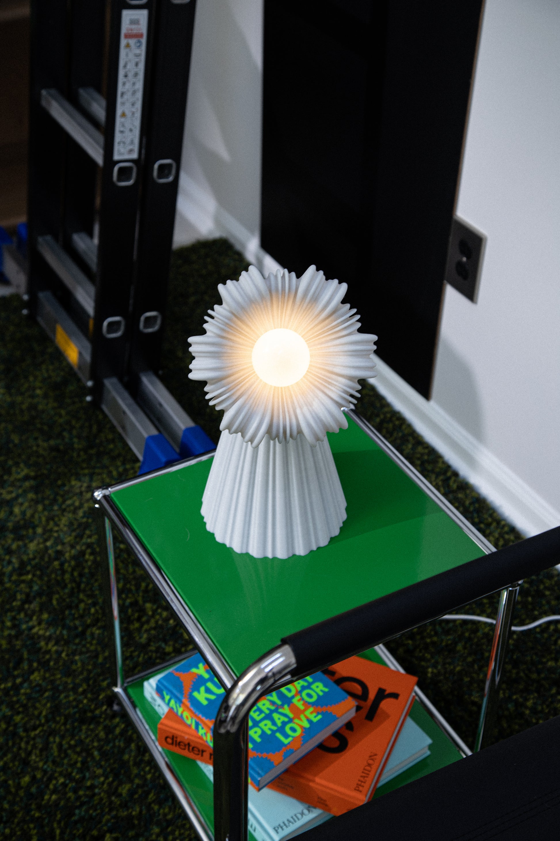 The first edition is printed in a sparkly white PLA with a soft texture and understated sheen. Its subtle silver glitter introduces a faint gray tint, adding depth without overwhelming the form. This material is naturally more translucent, allowing the lamp to emit a warm, diffused glow that highlights each pleat. It’s the purest expression of the design light, calm, and quietly expressive.